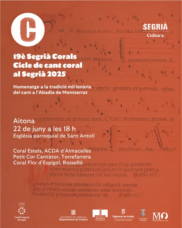 Enguany el cicle Segrià Corals ret homenatge a la tradició mil·lenària de cant coral que es viu a l’Abadia de Montserrat. Per aquest motiu, les tres corals oferiran com a cants comuns el Virolai i Stella Splendens, partitura medieval que pertany al Llibre Vermell de Montserrat.