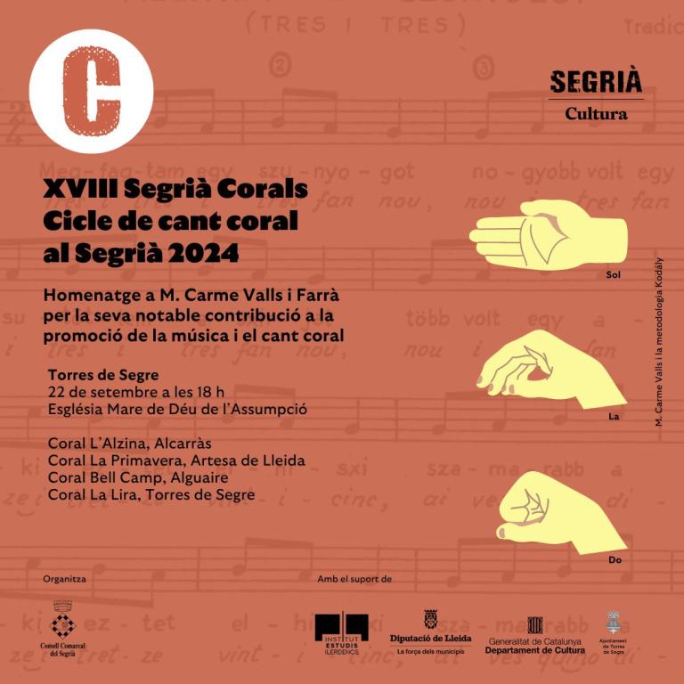El cicle Segrià Corals del 2024 vol retre homenatge a M. Carme Valls per la seva notable contribució a la promoció de la música i el cant coral. Valls serà present al concert de Torres de Segre i el públic tindrà ocasió de cantar juntament amb les quatre corals sota la seva direcció.