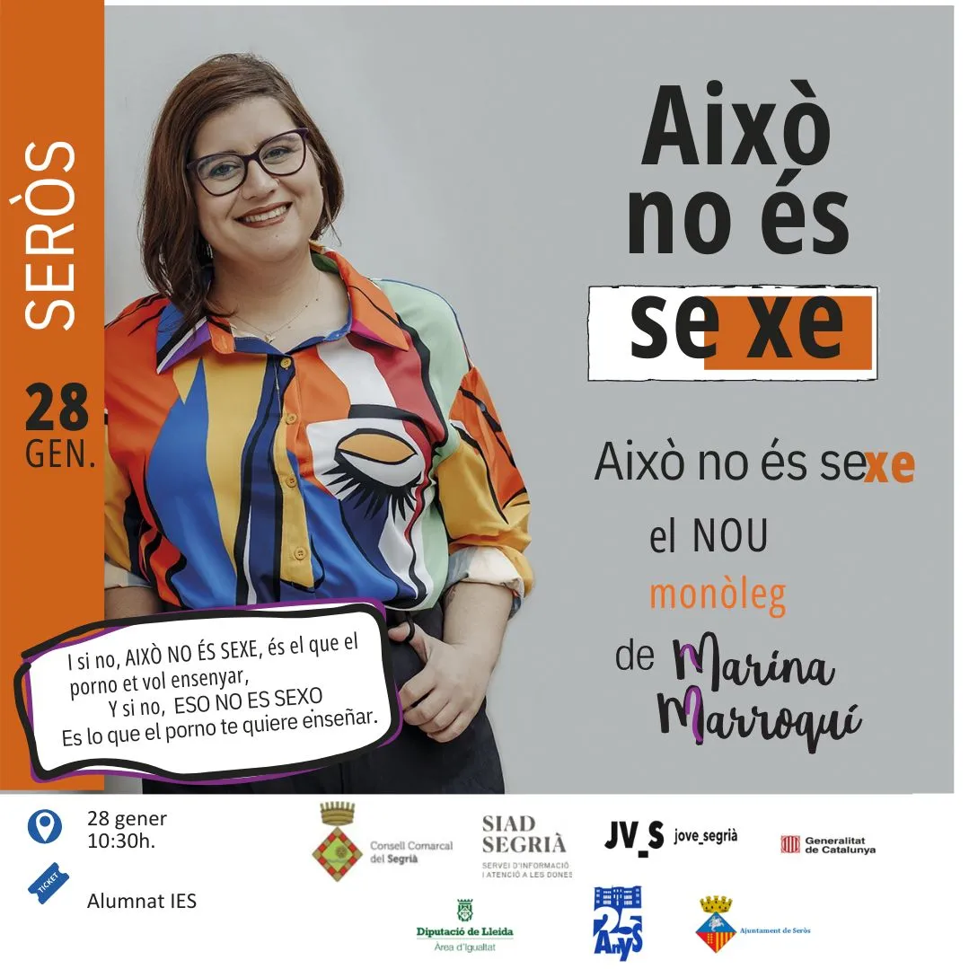 A les 10.30 h Marina Marroquí mostrarà el seu monòleg "Això no és sexe" sobre la inadequació del porno a les relacions sexuals saludables, pensat pel públic jove, que serà l'alumnat de l'IES. L'activitat es fa amb la col·laboració de Jove_Segrià.
