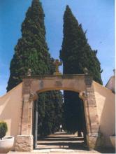 Destaca la portalada monumental que dona accés al cementiri catòlic o part antiga, amb carreus de pedra a cara vista; portes de ferro original de 1905; conjunt de xiprers centenaris; panteó familiar d'estil popular del 1950, propietat de la família Fontanet-Coca; i tres sepultures el primer terç del segle XX.